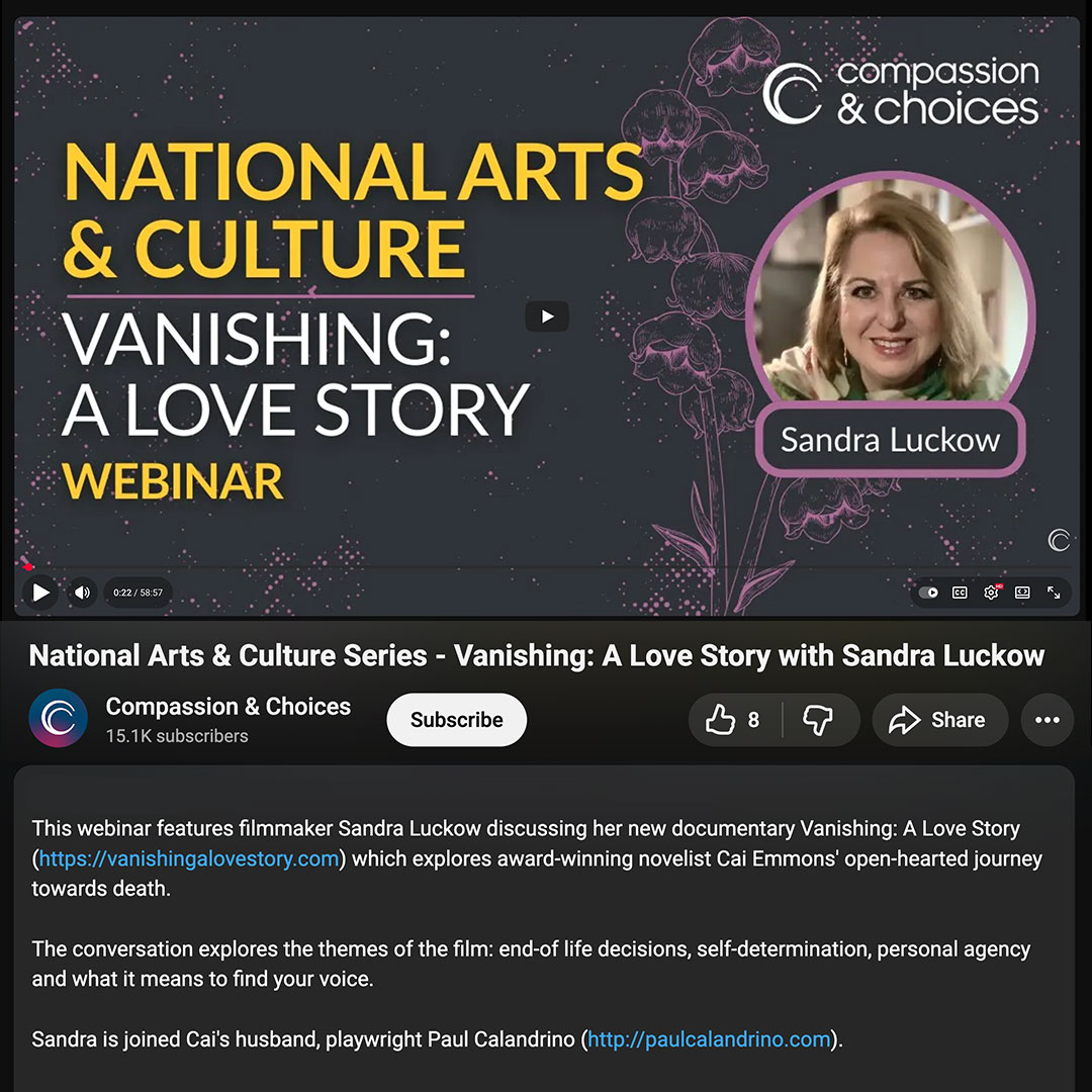 “Sandra Luckow’s Vanishing offers an almost shockingly close-up view of a life well lived and arguably well ended. Focused raptly on the late author Cai Emmons, the film is documented from so deep within her home and intimate circle that at times it also seems to have been shot from inside her head. Emmons is the intellectual driver of Vanishing—but it’s Luckow’s principled humility before her subject, and before the inescapable realities of illness and death, that enable this film to begin in voicelessness and dissolution and end in eloquent affirmation.“